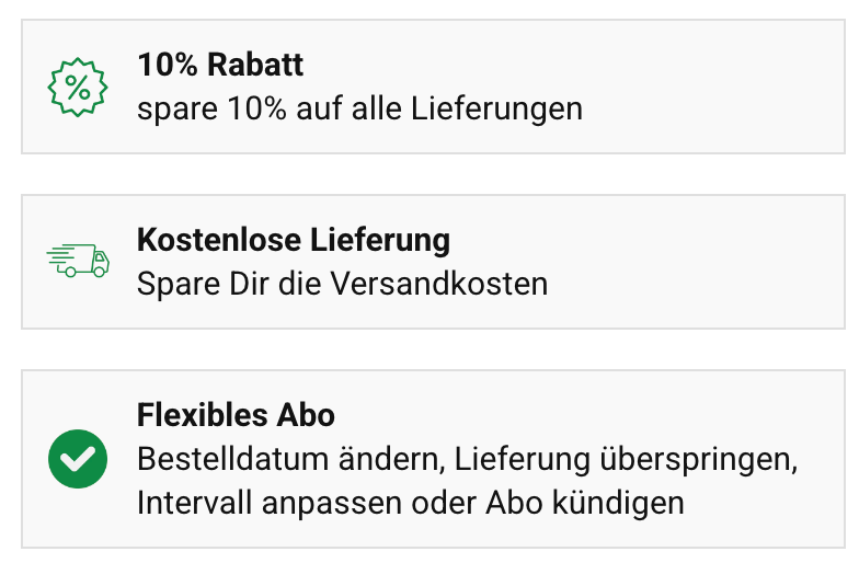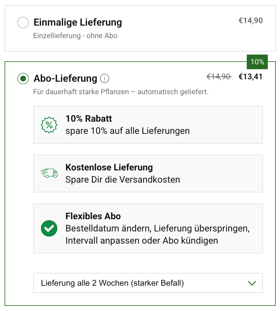 Active la opción de suscripción directamente en la página del producto correspondiente, seleccione el intervalo de entrega deseado y complete el pedido como de costumbre.