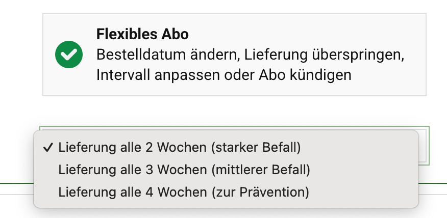En cambio, puedes Saltar una entrega, ajustar el intervalo de entrega o incluso para cambiar el producto dentro de la suscripción – especialmente práctico si prefieres productos GREEN GUARDIA diferentes según la temporada.